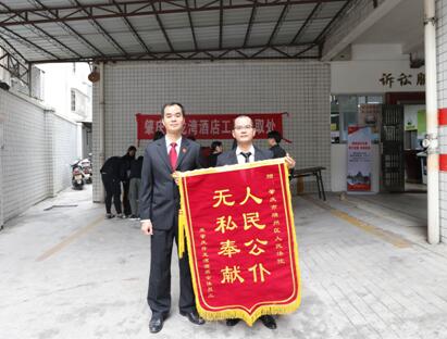 (图为肇庆某酒店员工代表为法院赠送锦旗)