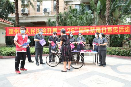 在“6.26”国际禁毒日来临之际,为深入推进打击治理电信网络诈骗和毒品预防工作,增强人民群众禁毒、拒毒及反诈意识, 6月25日,端州法院干警来到信安社区鸿景观园小区开展禁毒暨“全民反诈工程”法治宣传活动,为社区群众普及禁毒及反诈法律知识,营造禁毒防毒和“全民反诈”的良好氛围。