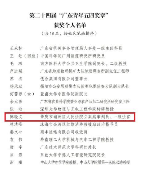 近日,共青团广东省委员会、广东省青年联合会联合印发《关于颁授第二十四届“广东青年五四奖章”的决定》,授予肇庆市端州区人民法院陈晓文等18人“广东青年五四奖章”。陈晓文同志为本年度全省法院系统及全市唯一获得此项殊荣的个人。