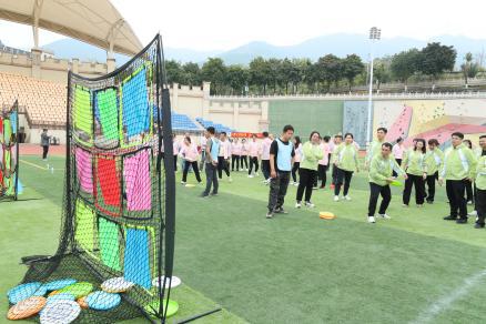 本次运动会共设置了“鸿运大彩球”“飞盘九宫格”“百人战鼓”等5个趣味项目,全院干警分别组成五支队伍参加。