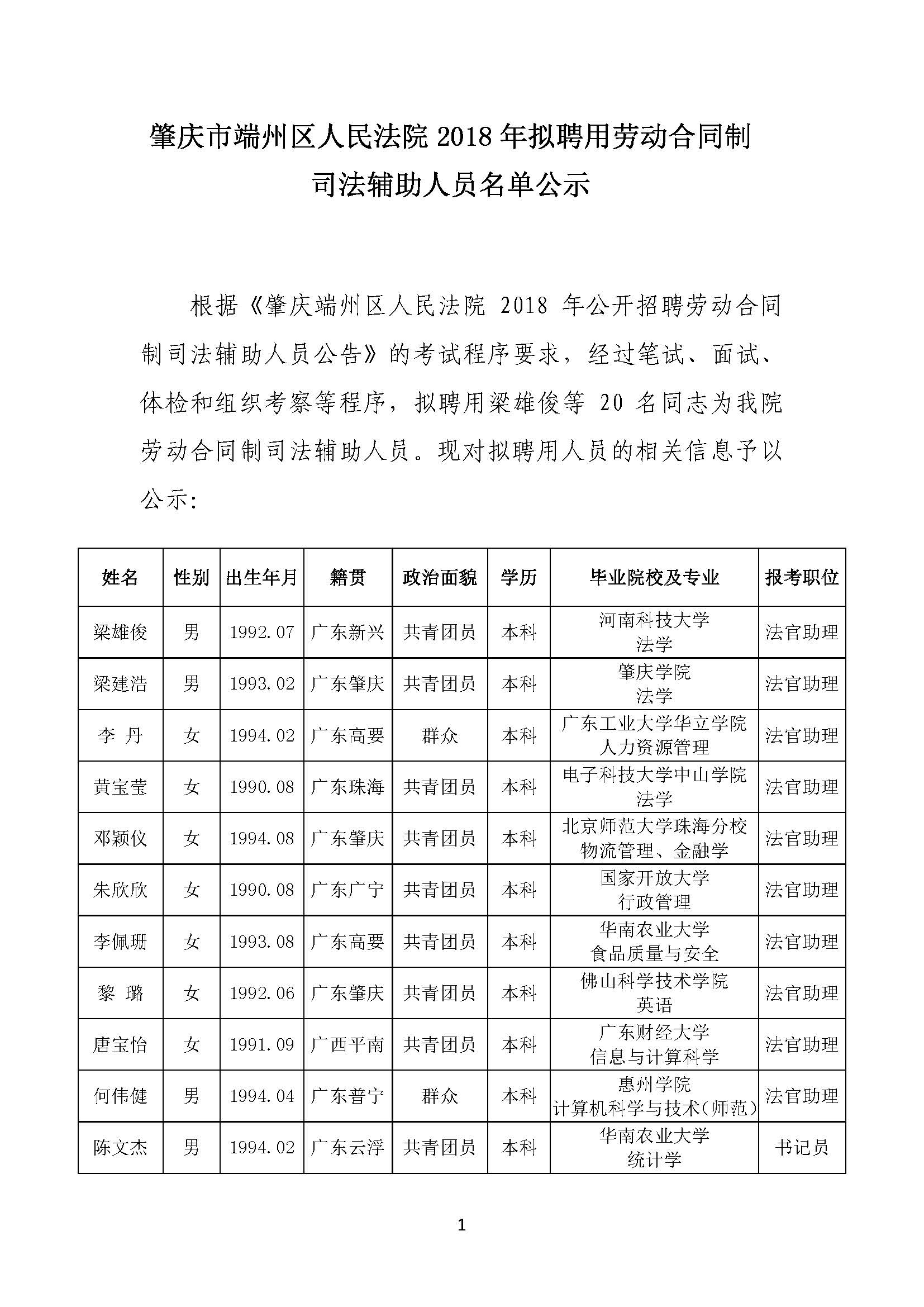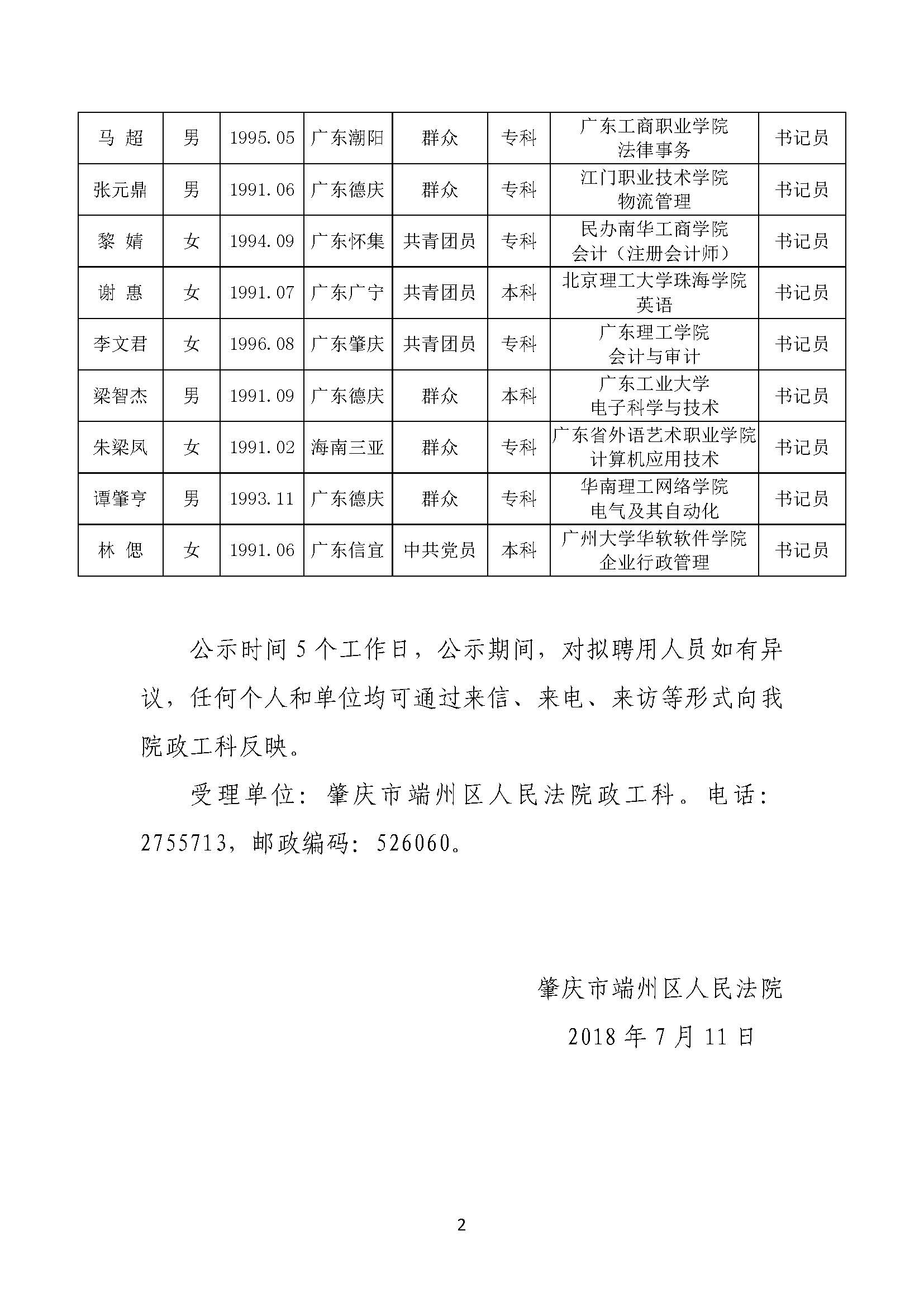 肇庆市端州区人民法院2018年拟聘用劳动合同制司法辅助人员名单公示