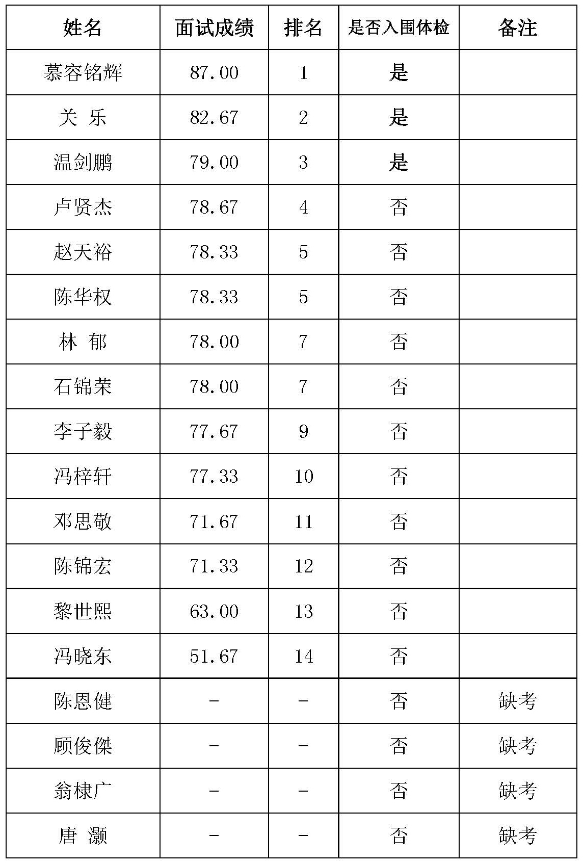 根据《肇庆市端州区人民法院2019年公开招聘劳动合同制司法警察辅助人员公告》的考试程序要求,现将我院2019年公开招聘劳动合同制司法警察辅助人员面试成绩和入围体检人员名单予以公布: