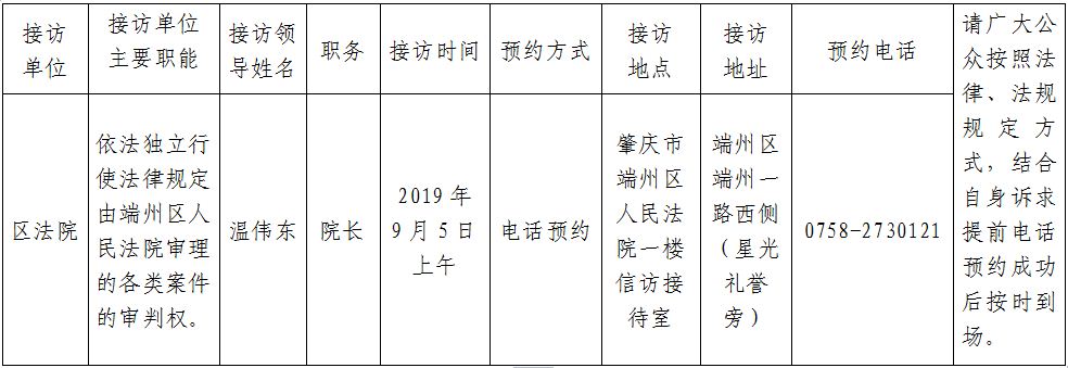 2019年9月5日上午由区委政法委、区法院、区检察院、端州公安分局和区司法局举行涉法涉诉类有关合理诉求的预约接访活动,具体通告如下: