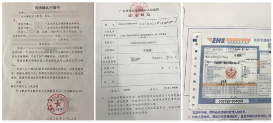 (图为司法确认申请当天在线完成的民事裁定书及送达回证)