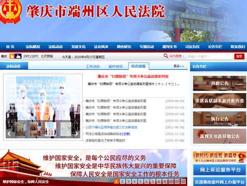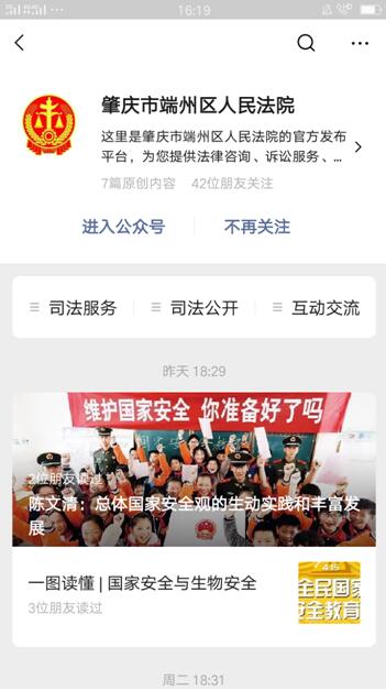在全民国家安全教育周,端州法院充分发挥新媒体优势,通过法院官网、微信公众号、诉讼服务大厅电子显示屏等多种平台,推送国家安全知识,突出宣传公共卫生安全、疫情防控知识、扫黑除恶、企业复工复产等内容,营造浓厚法治宣传氛围。