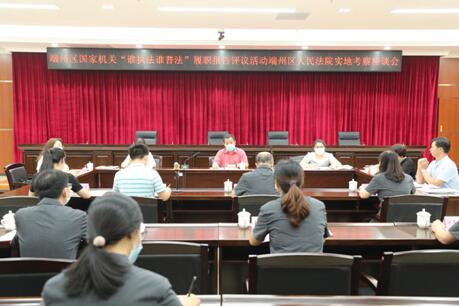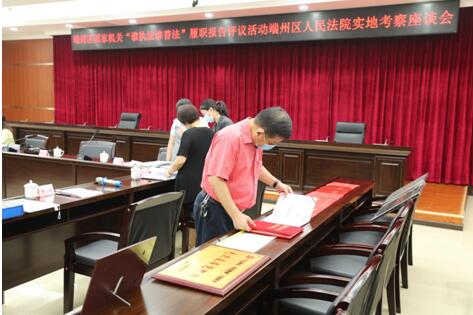 6月18日上午,区第三届国家机关“谁执法谁普法”考察组到端州法院开展“谁执法谁普法”履职报告评议活动实地考察。考察组由区政协办港澳委员会主任黄海风,区普法办常务副主任、区司法局副局长梁仕祥及相关法学专家代表、新闻媒体代表、律师代表、基层群众代表等组成。院党组成员许钢、苏彤等同志陪同。